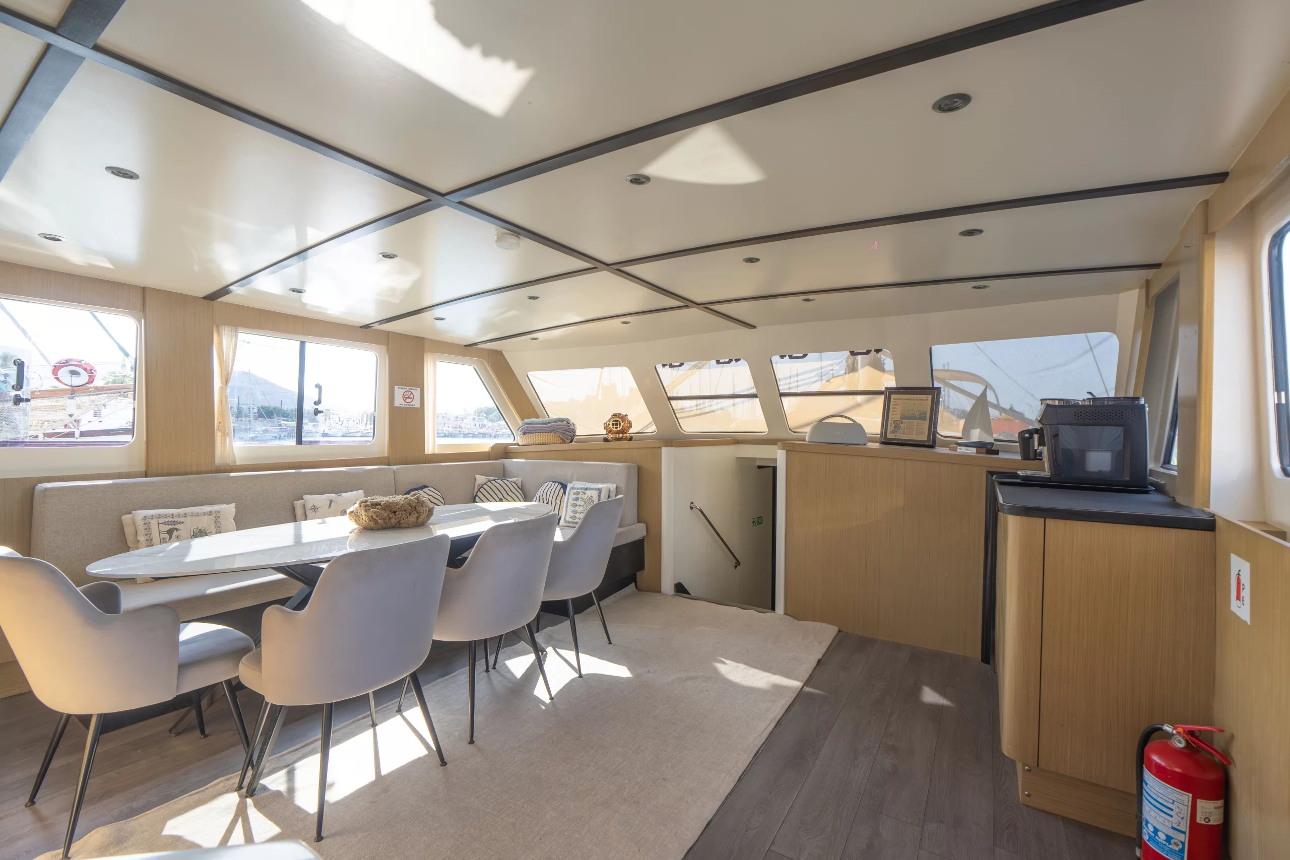 The saloon is spacious and filled with natural light, featuring a comfortable dining area and lounge space. Combined with wide passageways and a modern galley, Giulietta offers a relaxed, hotel-like onboard experience throughout the cruise.