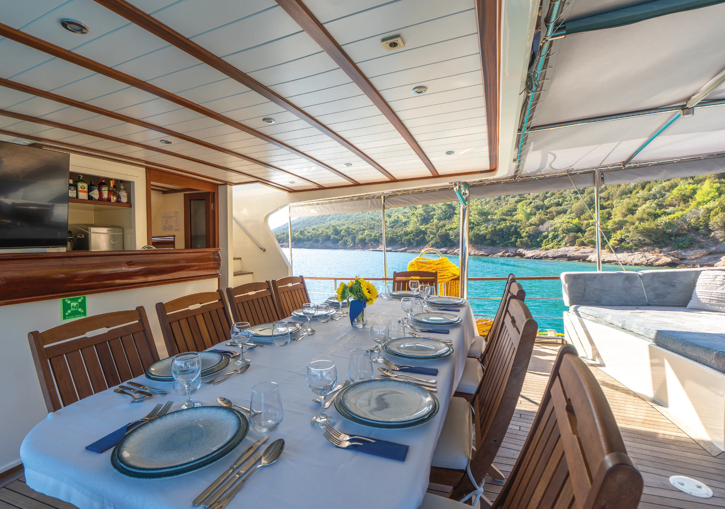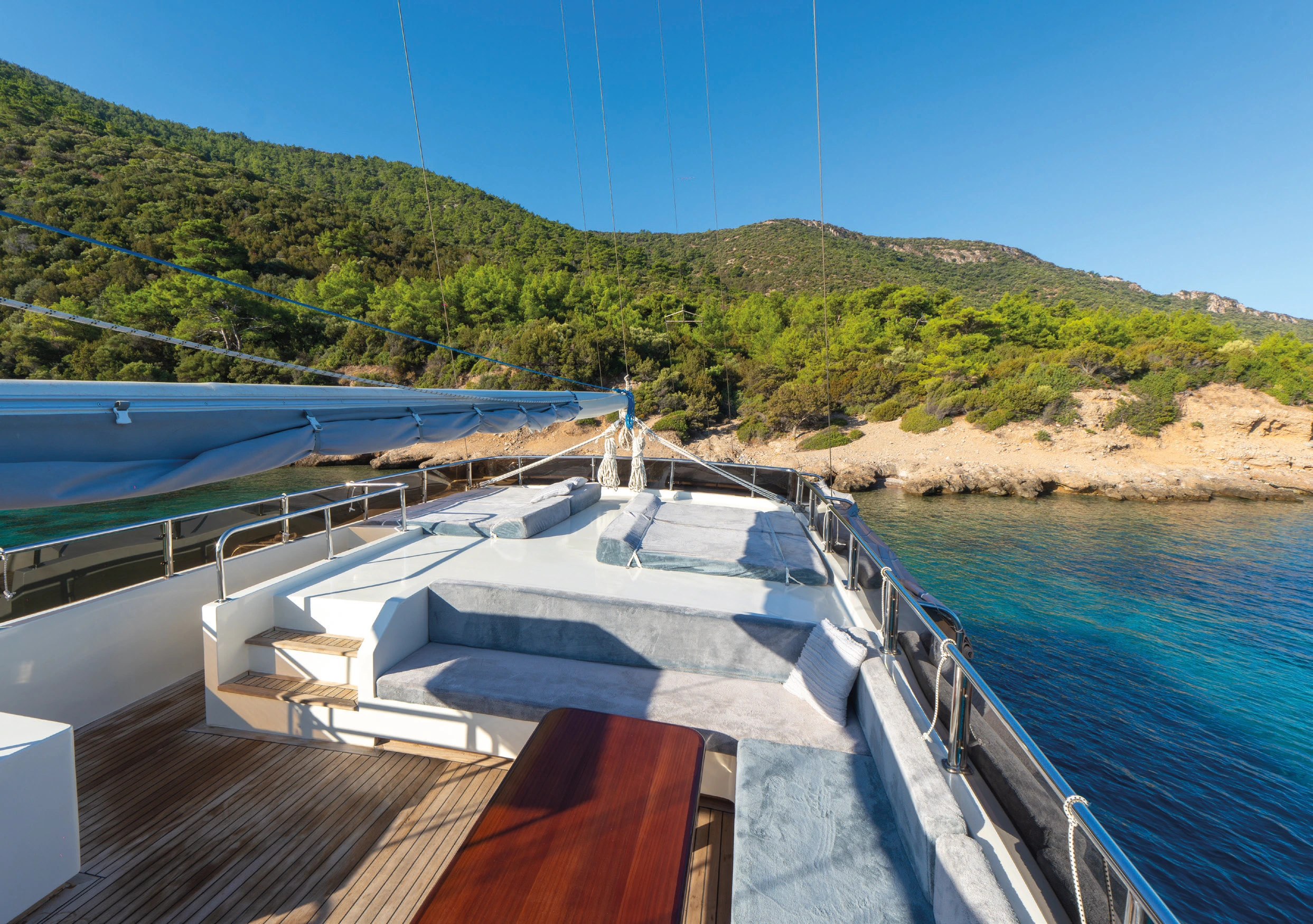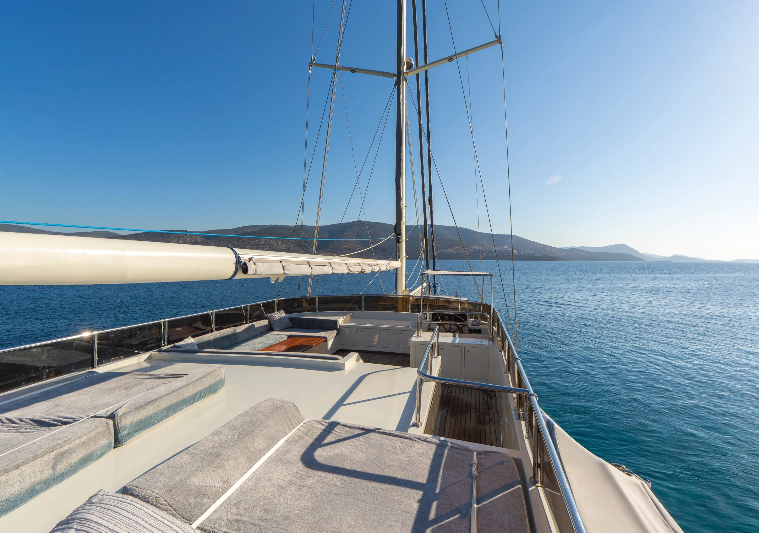 With her wide beam and thoughtfully designed deck layout, GIULIA provides generous sunbathing areas, comfortable alfresco dining, and smooth transitions between indoor and outdoor spaces. She is an ideal choice for families and groups seeking a refined yet relaxed yacht holiday in Bodrum and the Aegean.